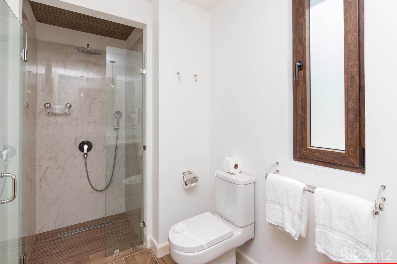 Each of the Six bedrooms features a full en-suite bathroom, providing ultimate comfort and privacy. The master bedroom on the second floor offers an elevated en-suite experience with a bath and shower oriented to maximize the ocean view. Four of the bedrooms come with 50” smart TVs, ample closets, and walkout terraces facing the ocean. The fifth bedroom, located just beyond the kitchen on the main level, is equipped with bunk beds, making it ideal for children. The main floor master bedroom, adjacent to the living area, is perfect for guests or those who prefer to avoid stairs.