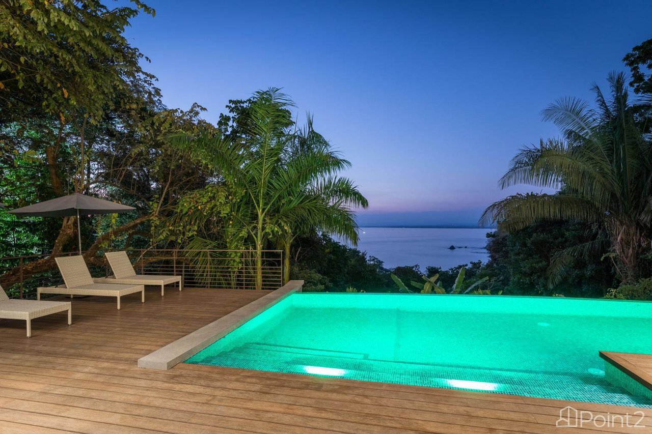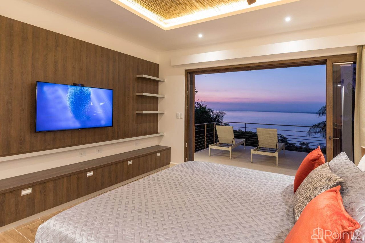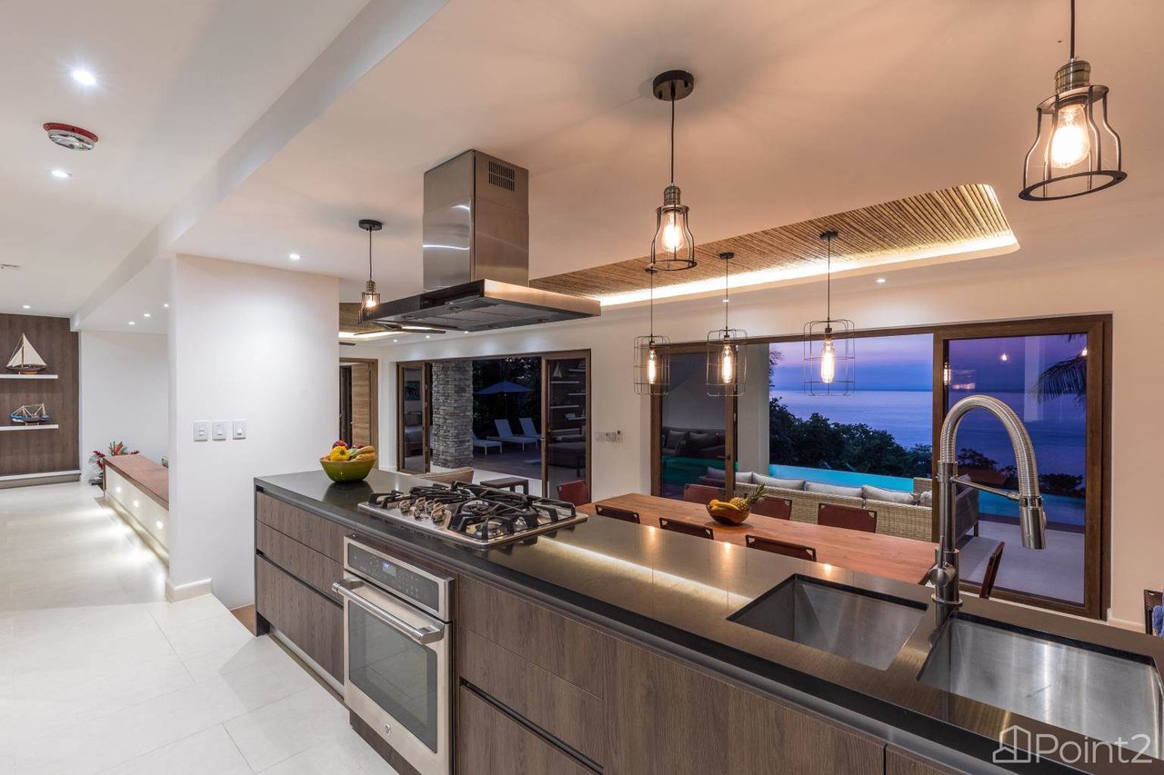 Step into the open-concept living, dining, and kitchen area, where wall-to-ceiling folding glass doors open onto the pool area and spacious terrace. The panoramic views of the ocean and mountains, framed by lush jungle, will leave you in awe.