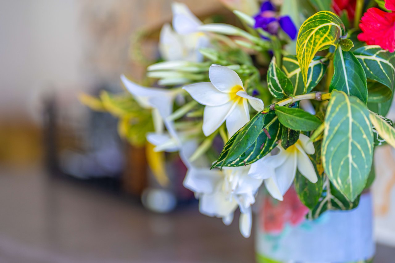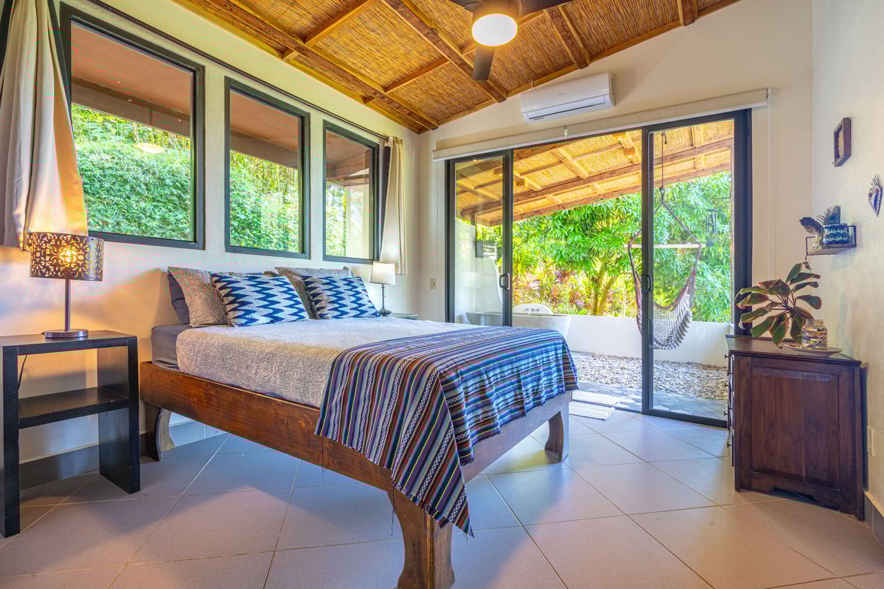 Inside, Casa Vida Tranquila features three spacious bedrooms and two bathrooms, plus an additional office/gym space. The primary bedroom includes a queen bed, air conditioning, and a Balinese-inspired outdoor bathroom with a carved soaking tub. Relax in unparalleled comfort at dusk or dawn, surrounded by the jungle's symphony and the distant sound of waves.