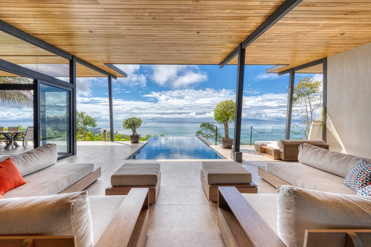Step into the living space of Hermosa Retreat, a masterpiece of tropical sophistication, where every corner whispers luxury. Here, the indoors seamlessly blend with the outdoors, leading you to an expansive terrace. Imagine lounging on sofas, feeling the gentle breeze, or swaying peacefully in a hammock. This outdoor haven is not just a place but an experience, offering a serene backdrop for relaxation, yoga sessions, or meditative escapes amidst the embrace of nature's splendor.